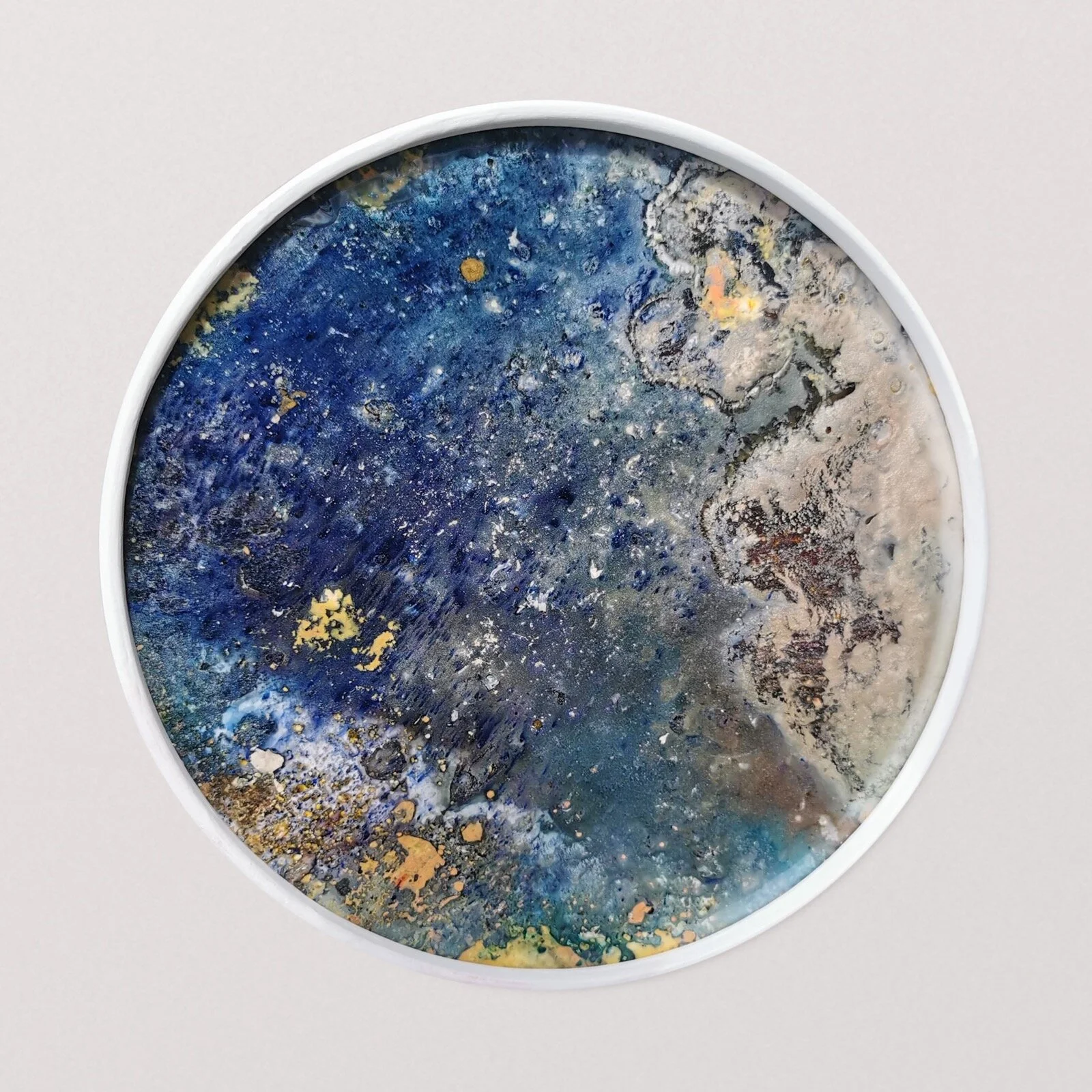 Oil, acrylic and household paints, ink, dye, pigment, salt, sand, sugar and lacquer on canvas/paper/cellophane. Diameter 20cm.